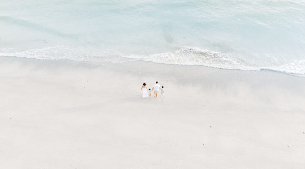 One of the unique things I offer my clients is the ability to see their story from a completely different perspective. St. Pete’s beaches give me the freedom to fly my drone, which means I can capture sweeping aerial shots of families walking along the shoreline, a couple framed against the endless Gulf, or children running in patterns only visible from above. These moments feel cinematic—like chapters in your story written across the sky.